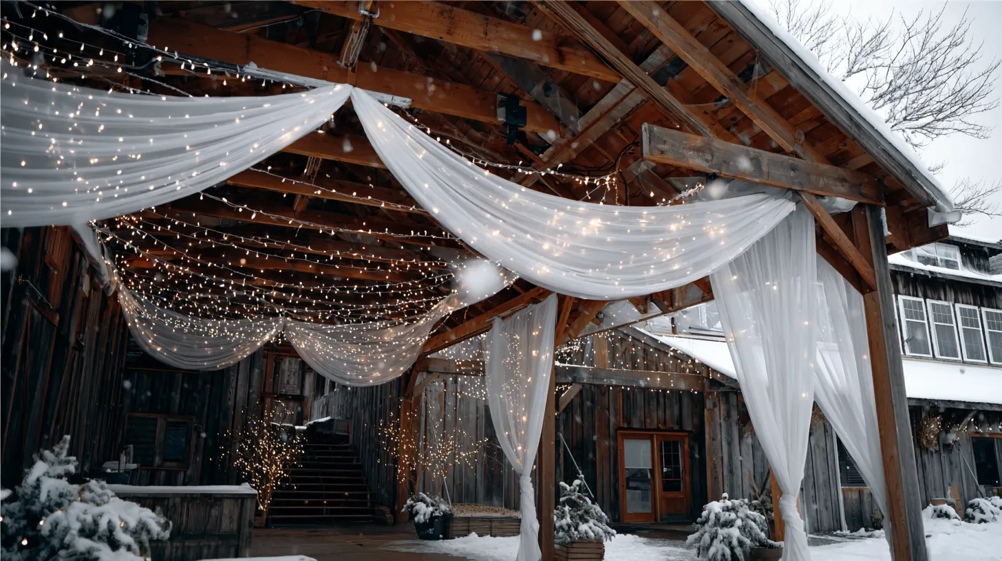 This picture showcases the most adorable and inviting white barn venue, looking absolutely picture-perfect for a rustic-chic winter wedding. The exterior boasts classic white wooden siding and traditional barn doors, all nestled in a light dusting of snow. Large, frosted evergreen wreaths hang on the doors and in the arched window above, adding a festive touch. The best part is catching a peek inside through the open doors, where you can see twinkling string lights and a gorgeous chandelier, hinting at the warm and magical celebration happening within.