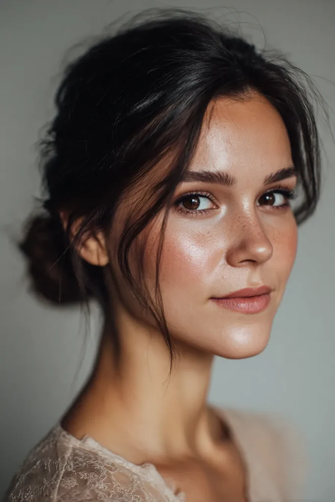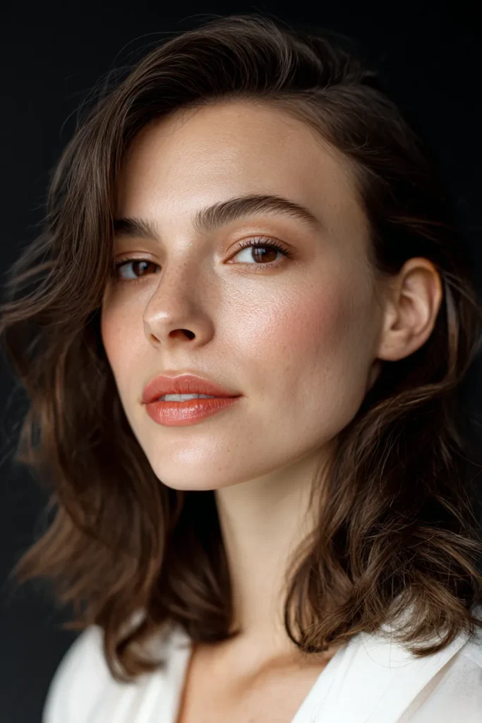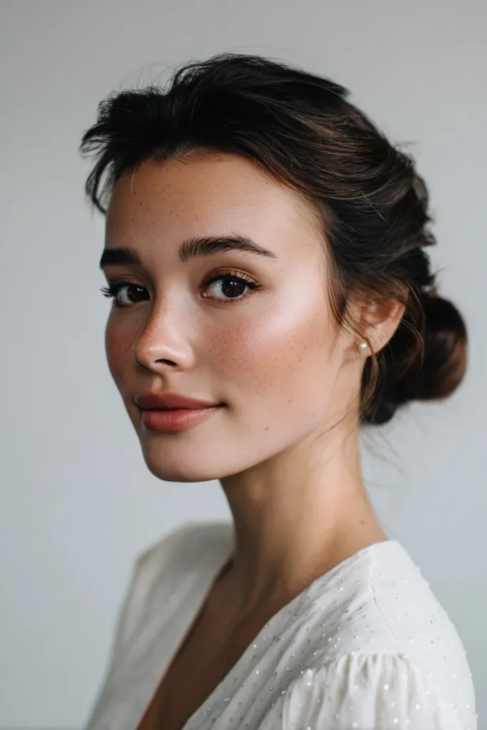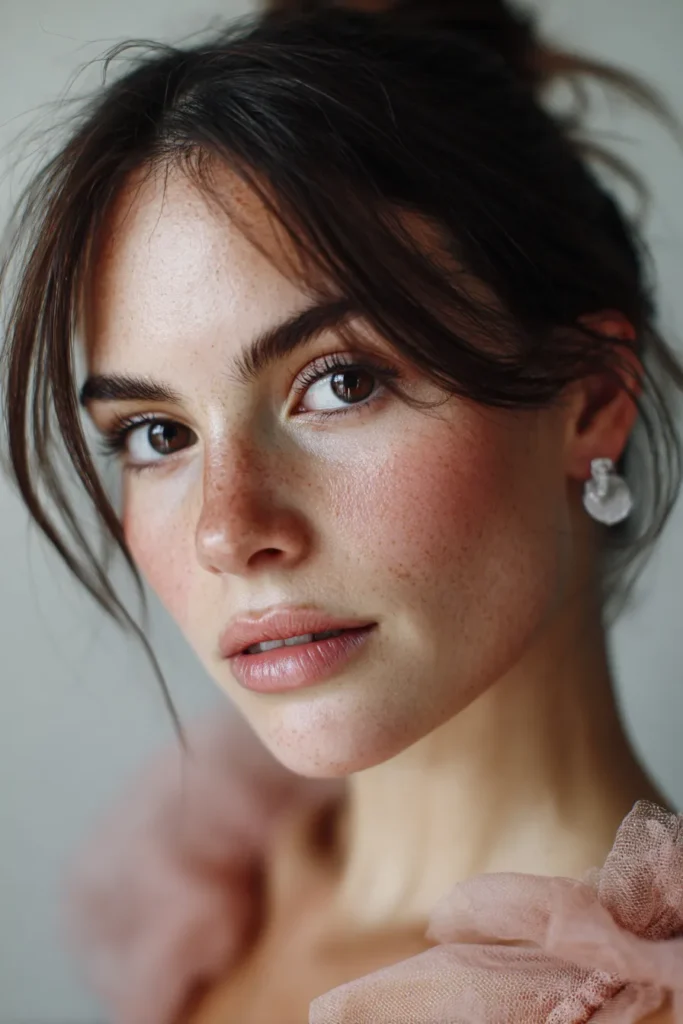 This makeup look is all about a fresh, luminous skin finish with a gorgeous scattering of natural freckles peeking through. The eyes are kept minimal yet defined with a soft brown in the crease, a subtle shimmer on the lid, and perfectly groomed, feathery brows. A gentle peachy-pink blush is applied high on the cheeks, pulling the color from the eye area down for a cohesive flush. The lips are painted with a soft, natural pink-nude that looks incredibly juicy and hydrated.