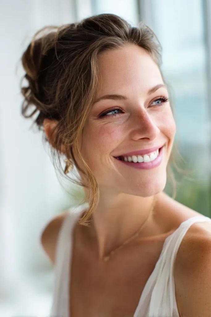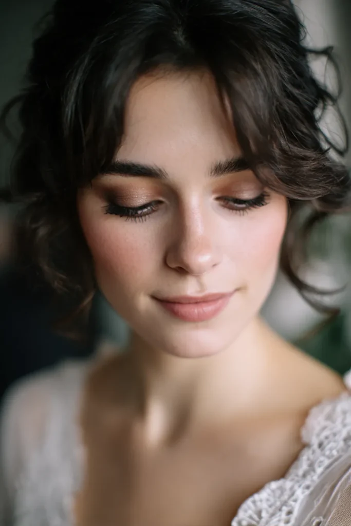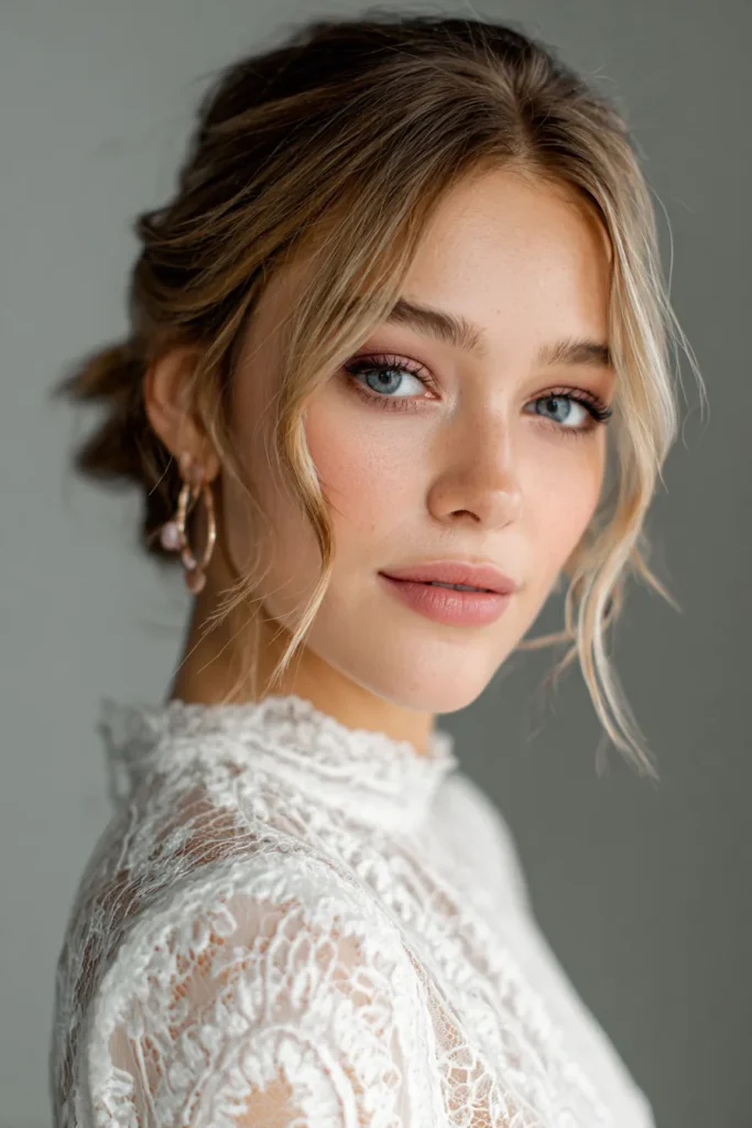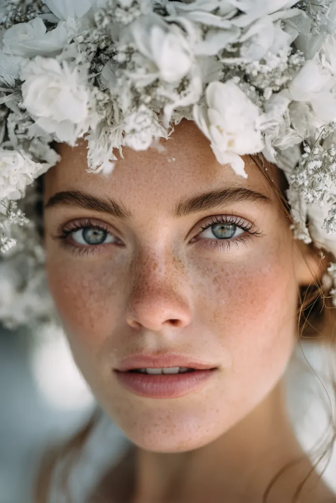 I honestly think this is the ultimate minimalist bridal moment. It feels so ethereal and captivating, especially with that stunning white floral crown. It’s fresh, it’s modern, and it really lets your natural beauty take center stage. If you’re into that clean, effortless aesthetic where you still look completely like yourself, this is totally the way to go. It proves that you don’t need tons of heavy makeup to look absolutely mesmerizing on your wedding day—sometimes less is truly so much more.