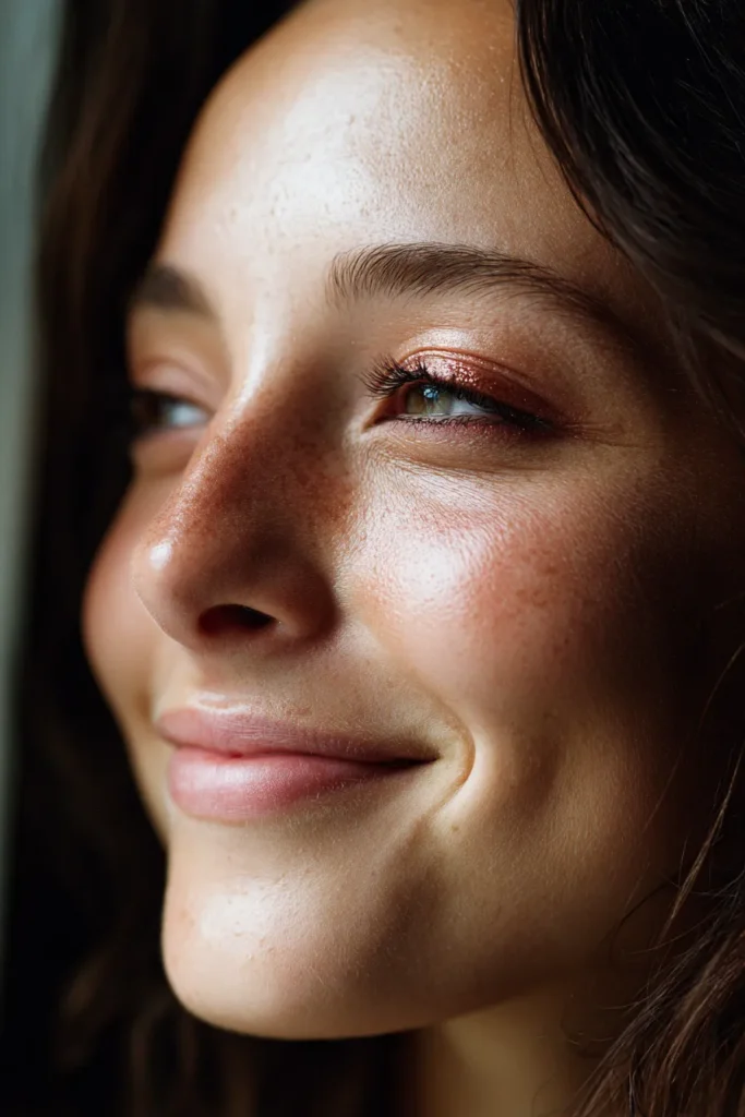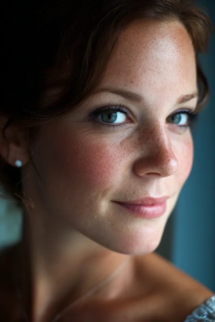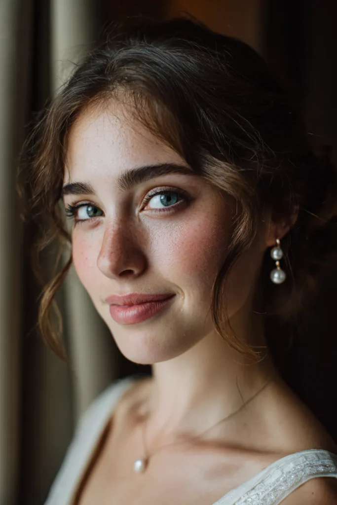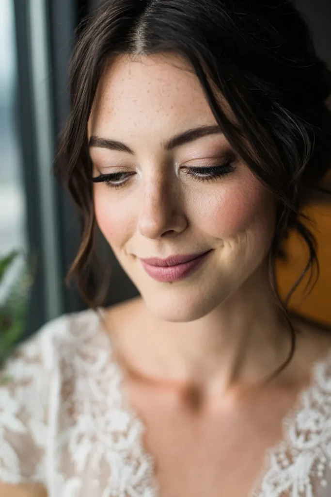 I am so completely smitten with this makeup because it’s the definition of happy, healthy radiance. The way that shimmery shadow catches the light is just stunning, adding a subtle touch of glam without overpowering the face. The emphasis on glowing skin and those adorable freckles keeps it feeling so fresh and authentic. It’s perfect if you want to look effortlessly beautiful and incredibly warm on your winter wedding day.