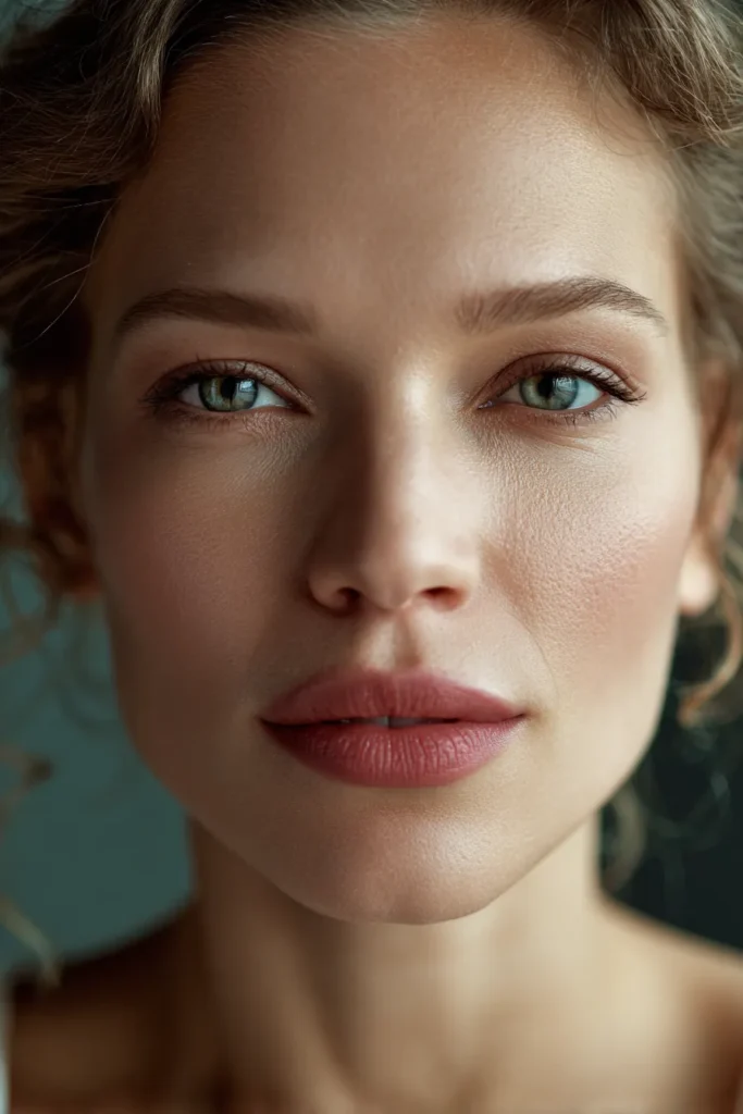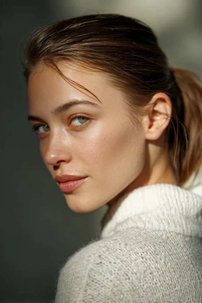 This makeup look is all about that super fresh, luminous skin that looks like it’s been kissed by the sun, complete with a natural scattering of freckles. The eyes are kept incredibly minimal, letting those gorgeous blue-green eyes truly pop with just a touch of mascara to define the lashes. The brows are natural and feathery, adding to the effortless vibe. There’s a subtle flush of warm, peachy blush on the cheeks, pulling the whole complexion together. The lips are simple and plump with a light, natural lip tint or balm that complements the overall warmth.