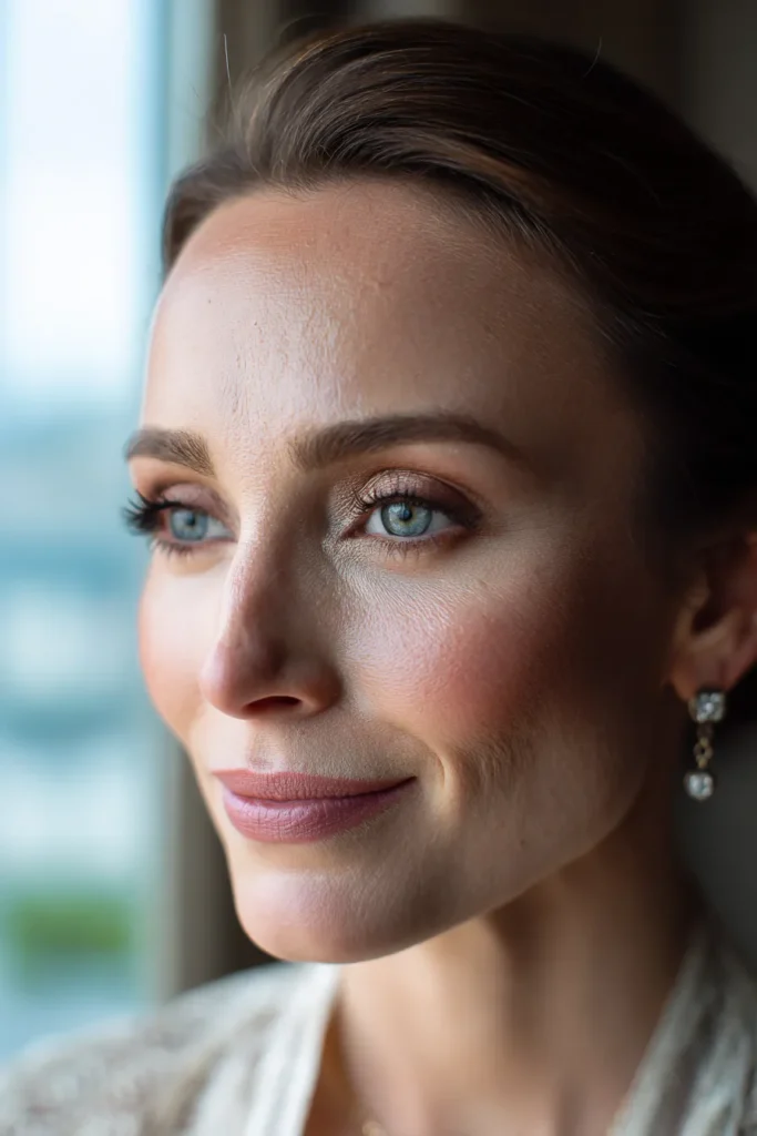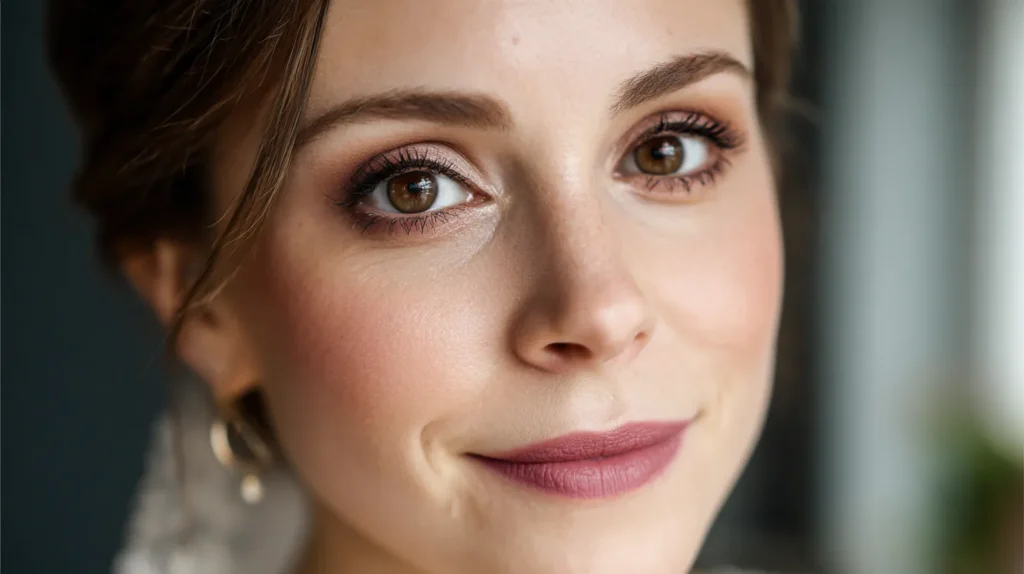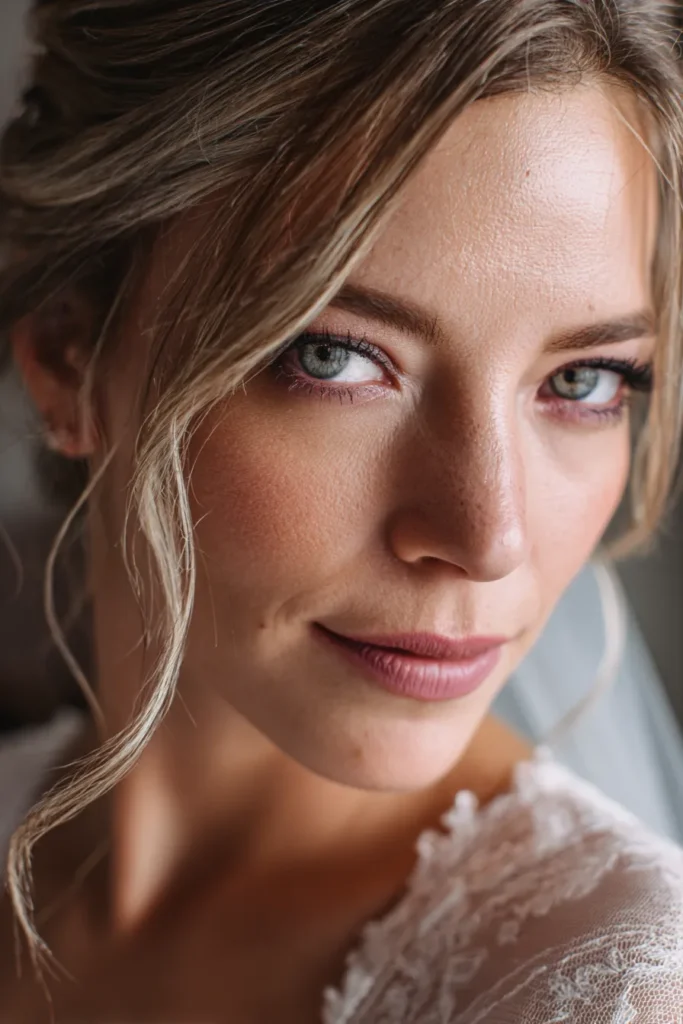 I absolutely adore this look because it’s the definition of timeless bridal beauty. It’s super polished and refined without ever feeling heavy, giving you that beautiful, soft-focus quality that looks incredible in photos. The cool mauve tones feel incredibly sophisticated and perfectly suited for a chic winter wedding. It’s all about balance here—the defined lashes and matte lip work together to create a stunning, romantic portrait that will feel classic for decades to come.