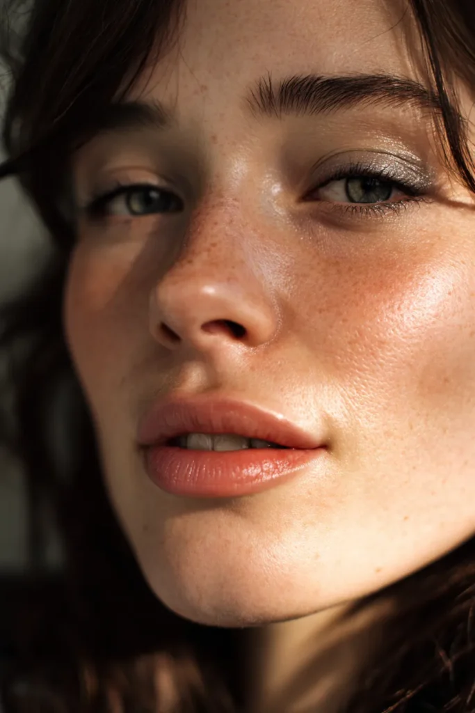 This incredible look is all about celebrating natural, dewy skin where those gorgeous freckles are the star and shine right through a minimal base. The eyes are kept ultra-light with just a hint of definition from perfectly curled natural lashes and a soft filling of the brows to make them look full and bushy. There is no heavy shadow, liner, or bold color here, keeping the focus entirely on a youthful freshness. The lips are simple and beautiful, finished with a clear or natural pink balm for a lovely, hydrated sheen.