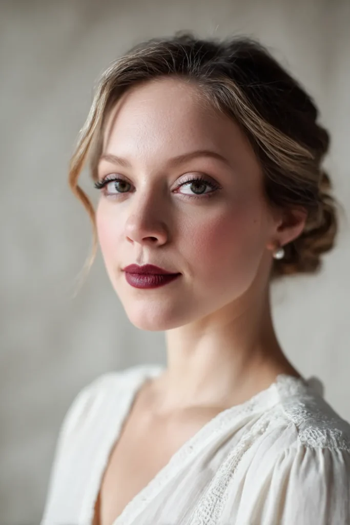 This beautiful makeup features a soft, luminous skin finish with a subtle highlight on the high points of the face, keeping the complexion clean and polished. The eyes are softly defined with a touch of light brown shadow in the crease and lovely, fluttery lashes, while the brows are well-groomed but not overly harsh. A subtle wash of rosy blush brings life to the cheeks, but the drama is all on the lips. They are coated in a rich, velvety deep berry or wine-colored lipstick, making a sophisticated statement.