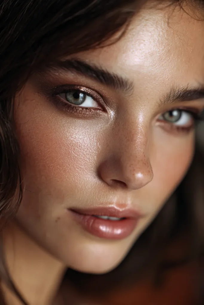 This absolutely captivating makeup is defined by an intense luminous skin finish that looks effortlessly expensive and glowing. The eyes are kept warm and simple, using a beautiful wash of shimmery light bronze eyeshadow on the lid and a touch of subtle definition in the crease. The brows are full, fluffy, and perfectly brushed up, creating a strong, modern frame for the face. A generous application of warm coral-bronze blush and highlighter is swept across the cheekbones, and the lips are plumped with a natural, peachy-nude gloss.
