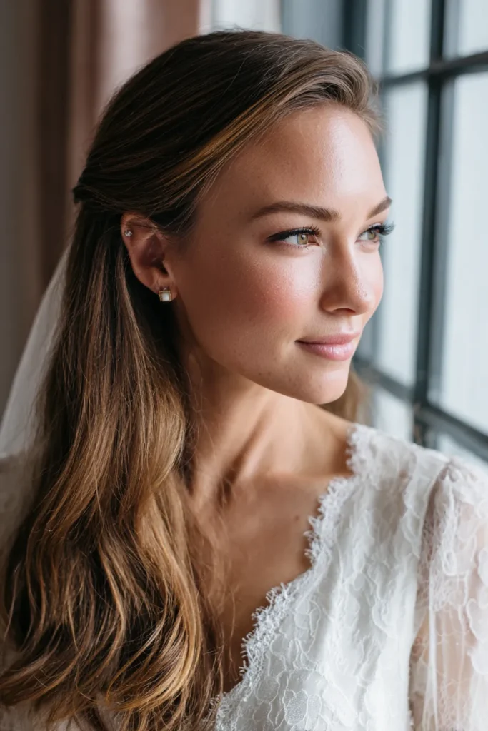 I’m completely captivated by this look because it’s the ultimate statement in modern minimalism. It takes confidence to go this clean, and the result is just unbelievably fresh and sophisticated. That incredible high-shine skin makes you look so youthful and healthy—it’s seriously goals. If you’re into the trendy clean girl aesthetic and want to look effortlessly radiant and utterly current on your wedding day, this glass skin look is a winner.