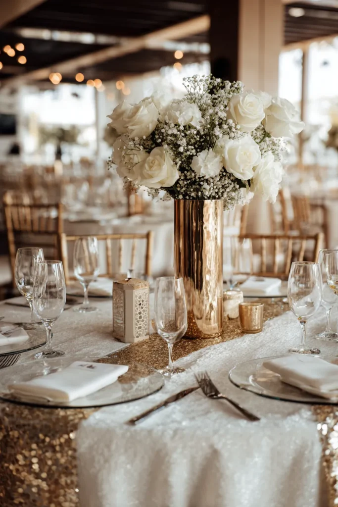 This look is all about that “wow” factor. A tall, shining gold cylinder vase creates a dramatic focal point on the table. It’s absolutely packed with a cloud of classic white roses and soft, airy baby’s breath, giving it a really romantic and full look. The table itself is covered in a show-stopping gold sequin tablecloth that cascades to the floor, shimmering under the lights. Mirrored plate chargers add another layer of reflection, beautifully framing the simple white napkins and elegant glassware.