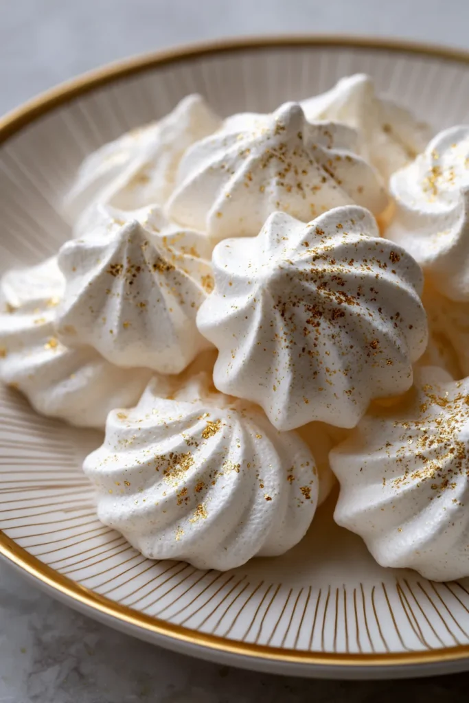 These little sweet treats are just the prettiest thing for a dessert table or as a take-home favor. The meringues are piped into a classic, delicate star shape with soft, snowy white peaks. They’ve been given a magical finish with a dusting of edible gold glitter or sprinkles across the tops, which makes them shimmer. They are sitting on a lovely ceramic plate that has thin, subtle gold rays painted around the edge, perfectly framing the delicate sweets.