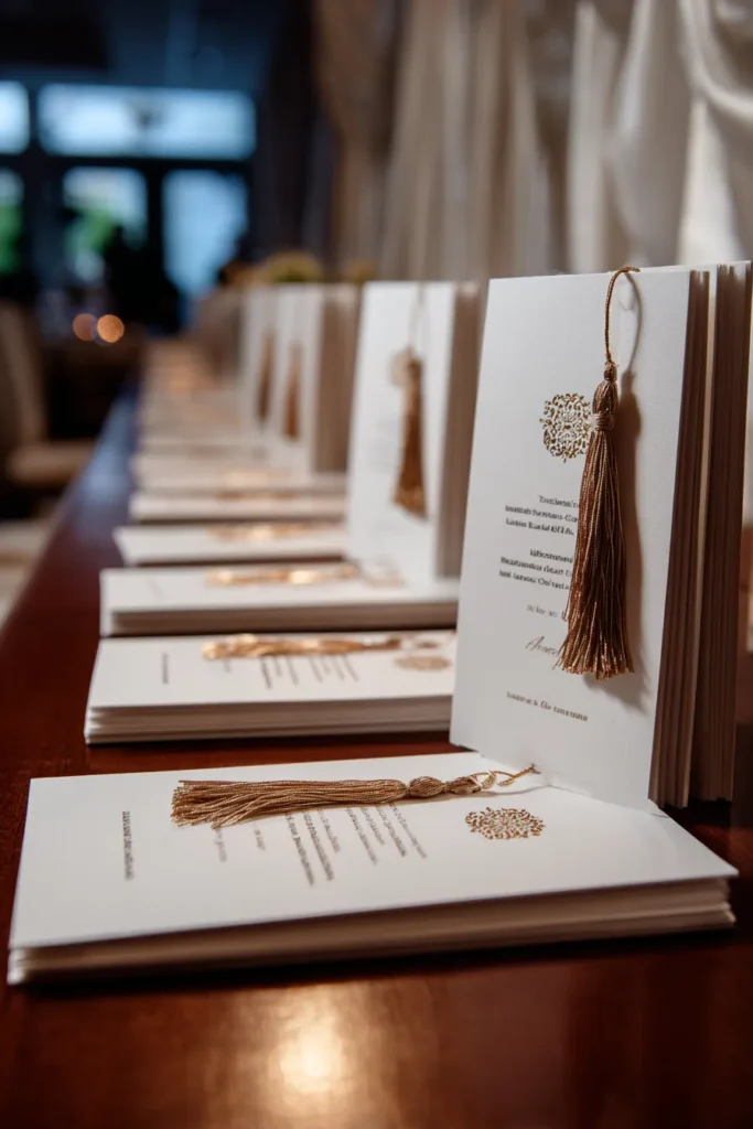 I think these programs are just so chic and thoughtful. That tassel detail instantly elevates them and makes them feel like a treasured keepsake, not just a pamphlet. The simple gold foil on the white paper is so elegant, and it really sets a sophisticated tone for the ceremony. It’s those small details that guests truly notice, and this is a stunning way to incorporate the white and gold theme into every part of your day. It’s just pure class.