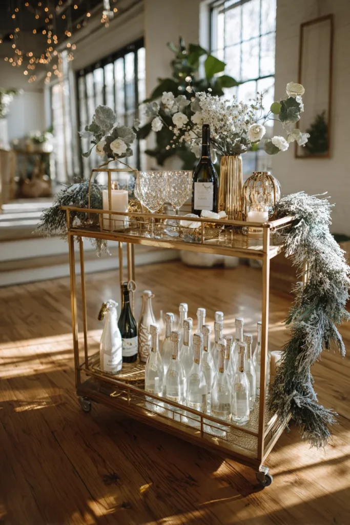 Oh my goodness, this bar cart is absolutely dreamy and perfect for a winter wedding! It’s a gorgeous gold two-tiered rolling cart, styled to perfection. The top shelf holds some beautiful white and green floral arrangements, sparkling glassware, and elegant gold candles and decorative accents. The real showstopper is the dusty frosted greenery garland draped over the side, giving it that perfect wintery touch. The bottom shelf is ready to serve with an array of mini champagne bottles.