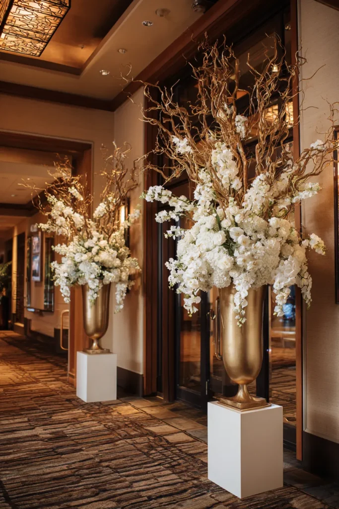 I truly think this is the most impressive way to greet your guests. The sheer scale of these arrangements just screams luxury and drama, and the gold branches look so magical, like something out of a fairytale. It perfectly sets a sophisticated tone the minute guests walk into the venue. The pairing of the heavy, antique-style gold vase with the light, airy white flowers is just beautiful contrast. It’s absolutely unforgettable, and I would love to walk through an entrance like this.