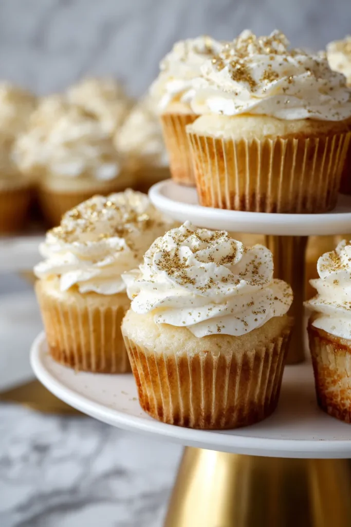If you’re into a sweet ending that’s both charming and totally on theme, these cupcakes are for you. They feature a fluffy white cake base tucked into simple pleated paper liners. Each one is topped with a generous swirl of creamy white frosting and finished with a dusting of sparkling gold glitter that catches the light beautifully. They’re presented artfully on a tiered white stand with a gorgeous gold pedestal base.