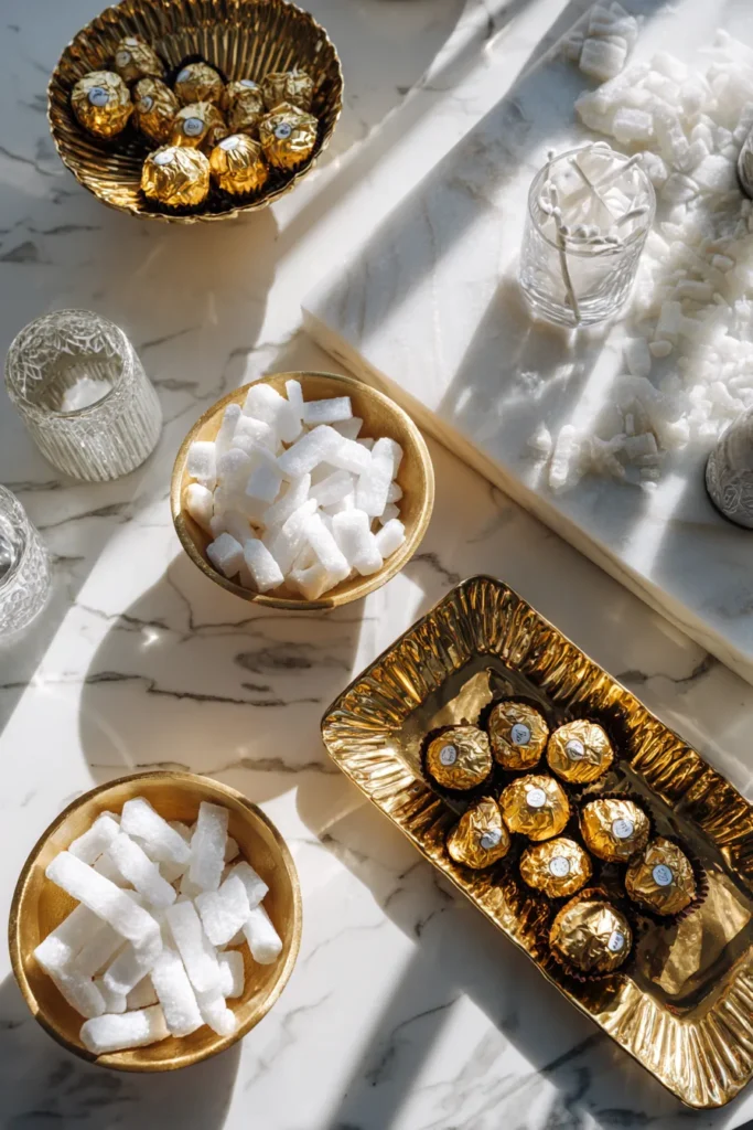 This gorgeous setup perfectly blends white and gold for a truly inviting sweet station. It features a stunning marble slab as its base, immediately signaling luxury. Various gold bowls and trays hold delicious treats, with Ferrero Rocher chocolates glistening in their gold wrappers and delicate white sugar cubes ready for coffee or tea. A pretty textured glass votive adds another layer of sparkle and charm, making the whole display feel very cohesive.