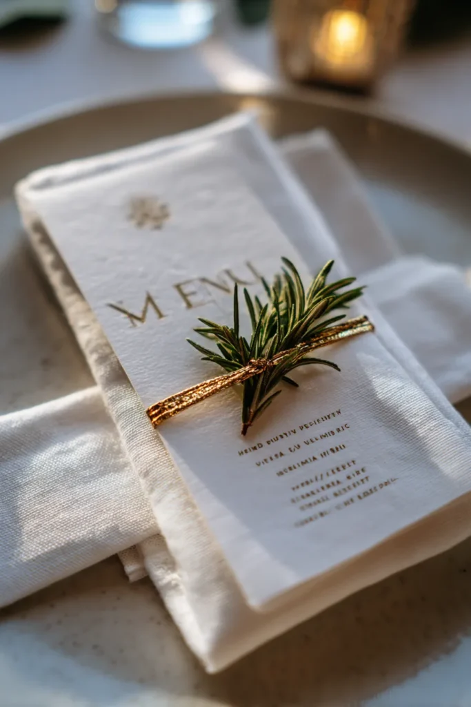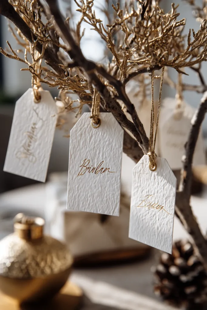 I am absolutely head over heels for this idea! It’s so much more creative than just laying a card on the table, and it truly brings in that winter magic in a sophisticated way. The combination of the rustic branches with the glittering gold and elegant white tags is just perfect. It feels personal and whimsical, and it would be such a joy for guests to find their names here. This is a brilliant way to incorporate natural elements with luxurious details for a truly memorable touch.