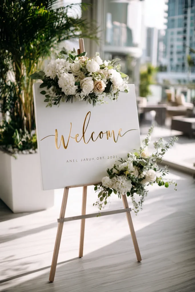 This stunning welcome sign is the perfect blend of modern elegance and romantic florals. A clean, crisp white board serves as the background for the word “Welcome” written in an exquisite gold calligraphy font, which really pops. The sign is framed by beautiful, asymmetrical arrangements of fluffy white hydrangeas, cream roses, and delicate greenery, giving it a luxurious and organic feel. It rests on a simple wooden easel, making it easy to display anywhere in your venue.