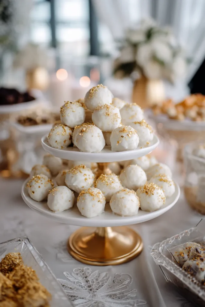 How cute are these little sweet treats, they are absolutely darling for a dessert display. These round cake pops are covered in a pristine white coating, making them look like perfect little snowballs. They are delicately sprinkled with edible gold glitter, which adds a lovely touch of sparkle and luxury. They’re beautifully arranged on a two-tiered white serving platter that has a matching gold base, perfectly centered among other treats on the table.