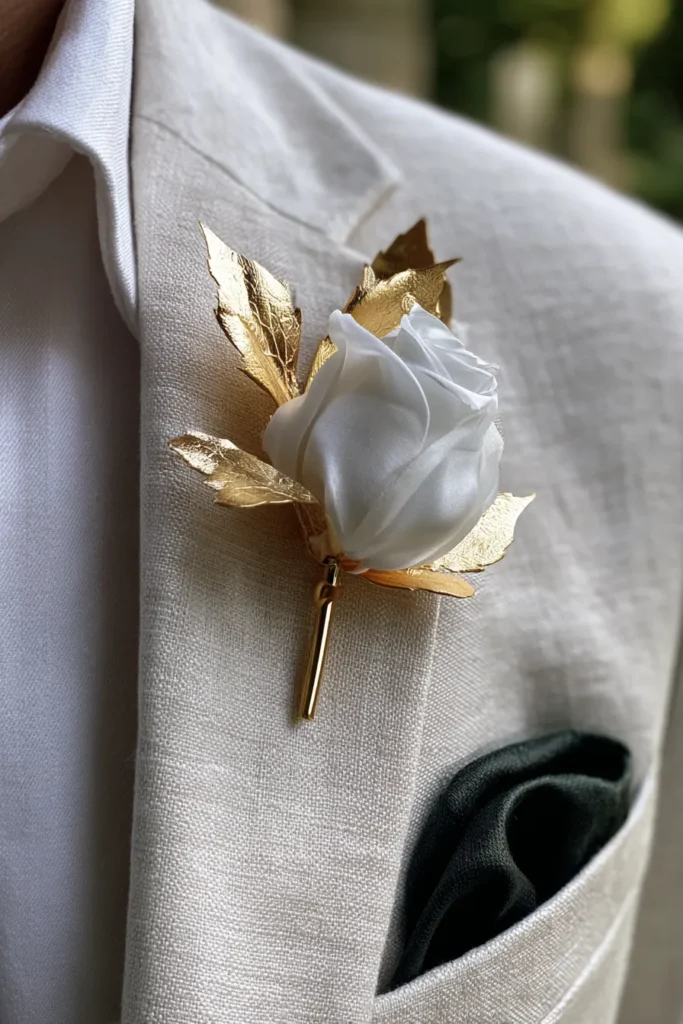 This boutonniere is the definition of timeless sophistication. A single white rose, soft and satin-like, is framed by metallic gold leaves that shimmer subtly against a cream linen suit. The combination feels classic yet striking, bringing a touch of royal charm to a winter celebration. The muted tones of ivory and gold pair beautifully, giving off that perfect balance of warmth and elegance.