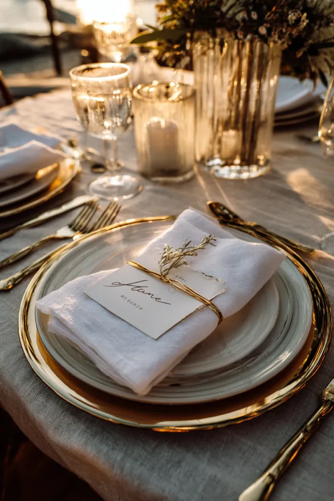 This tablescape is all about refined simplicity with a touch of warmth. Each place setting features a gorgeous gold charger that really makes the crisp white linen napkin and simple white dinnerware pop. The napkin is neatly folded and adorned with a delicate name card, held by a gold wire and a sprig of dried greenery for a natural, organic touch. Soft linen tablecloths in a neutral shade provide a relaxed backdrop, while a tall fluted glass vase filled with wispy dried flowers and a glowing candle in a hurricane lantern add height and a cozy glow to the center of the table.