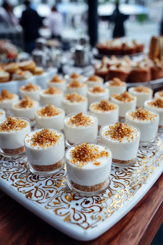 This display is a stunning way to serve up smaller desserts at your reception. It features individual cheesecake or yogurt parfaits in mini glass cups, each one sitting atop a crunchy graham cracker base and topped with a lovely swirl of cream. The most eye-catching part is the beautiful serving tray underneath, which has an intricate white and gold Moroccan tile-inspired pattern around the edges. A generous sprinkle of amber-toned sugar crystals on each cup adds a beautiful, festive touch.