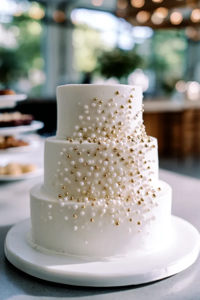 This wedding cake is the definition of chic and polished. It features a pristine white frosting on three perfect, round tiers. The decoration is simple but incredibly effective, with a stunning cascade of edible white and gold pearls running diagonally across the cake. The tiny, shimmering spheres are concentrated at the top and scatter beautifully towards the bottom, creating a delicate, luxurious texture. It’s sitting on a clean white cake stand that lets the decorations shine.
