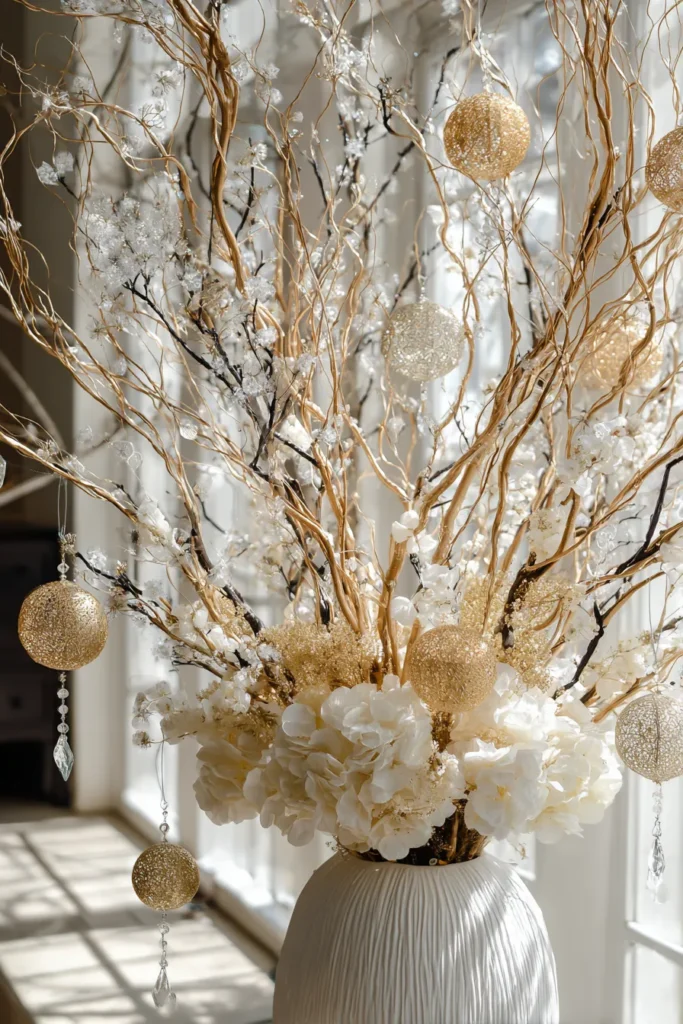 This is such an enchanting and impactful centerpiece or decorative accent for a luxurious winter wedding. It features a tall arrangement of branches that have been painted a dazzling gold, creating a beautiful, intricate silhouette. These branches are adorned with delicate white floral clusters, sparkling crystals, and various sizes of gold filigree ornaments, some with dangling crystal teardrops, making the whole display shimmer. It’s all housed in a chic ribbed white vase, providing a clean and elegant base.