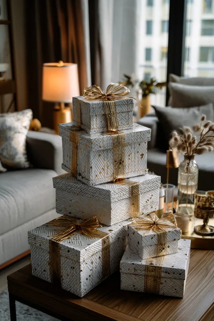 These stacked gift boxes are just the prettiest way to add some festive elegance to your decor, whether for a gift table or just as a decorative accent. They’re wrapped in crisp white paper featuring a delicate gold geometric pattern, creating a clean yet luxurious look. Each box is tied with a beautiful shimmery gold ribbon, some tied into a dramatic, voluminous bow, adding a touch of classic holiday glamour. They are casually yet artfully stacked on a rich wooden coffee table.