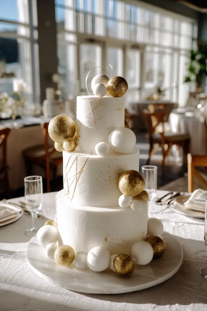 This gorgeous three-tiered cake is such a playful and modern take on luxury. The cake itself is covered in a smooth white frosting, with delicate gold brushstrokes and splatter details for a little shimmer. The real fun is in the decorations—it’s covered in various sizes of white and glittery gold spheres that cascade down the sides, making it look like bubbles or floating ornaments. The white spheres are simple, while the gold ones are covered in tiny, sparkling edible glitter.