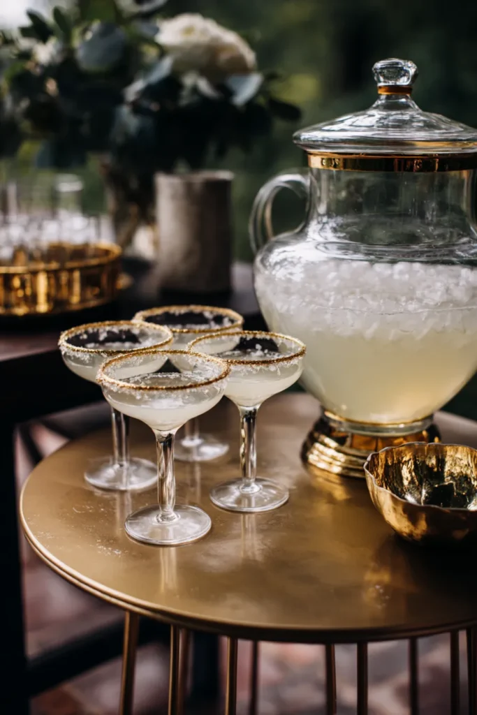 Talk about a chic setup. This little gold bar table is the perfect station for welcoming guests. It holds a set of gorgeous coupe glasses, all ready for sipping. Each glass has this amazing dark, sugary rim that looks so dramatic against the pale drink inside. A huge, stunning glass dispenser with fancy gold trim sits right beside them, filled with a delicious-looking chilled cocktail. Even the little hammered gold bowl adds an extra bit of sparkle.