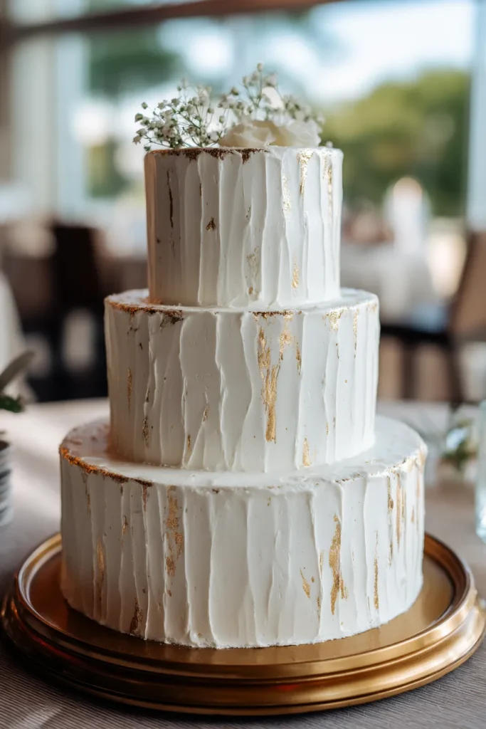 This gorgeous three-tiered wedding cake is a perfect example of modern elegance. It features a pure white buttercream frosting applied with a rustic, textured vertical swipe technique. This texture is highlighted beautifully with delicate streaks of edible gold leaf that catch the light. The cake is kept simple and chic, topped with just a small cluster of fresh white flowers and a whisper of baby’s breath. It’s all presented on a classic, polished gold cake stand.