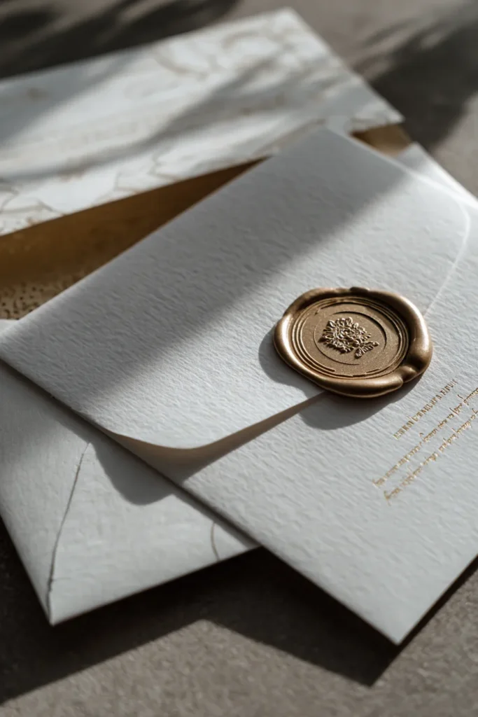 I absolutely adore a wax seal, and this gold one is just beyond. It instantly elevates the entire invitation, making it feel so royal and traditional. It tells your guests right away that your wedding is going to be a luxurious and sophisticated affair. Plus, that slightly rustic texture of the paper contrasting with the smooth, shiny seal is such a beautiful combination. Getting an invitation like this in the mail would completely thrill me.