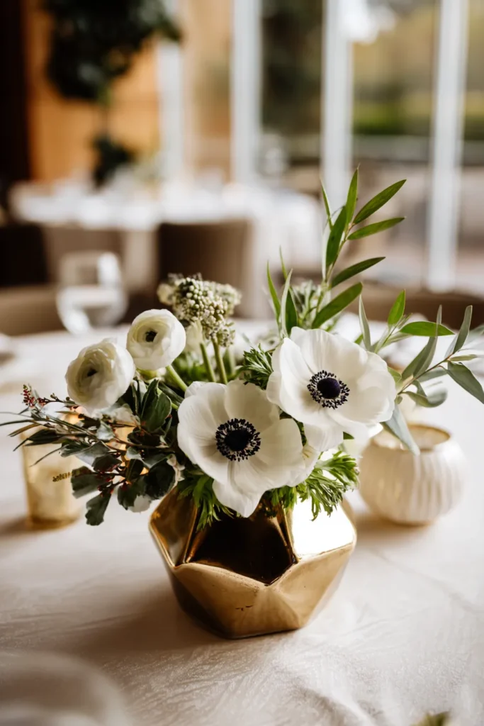 This absolutely stunning floral arrangement makes such a chic statement on a wedding table. It features striking white anemones with their dark centers, paired with delicate white ranunculus and textural sprigs of green foliage like eucalyptus. All of these beautiful blooms are held in a modern, faceted gold geometric vase that catches the light so beautifully. A couple of smaller, subtly ribbed white and gold candle holders complete the elegant tablescape, adding a soft glow.