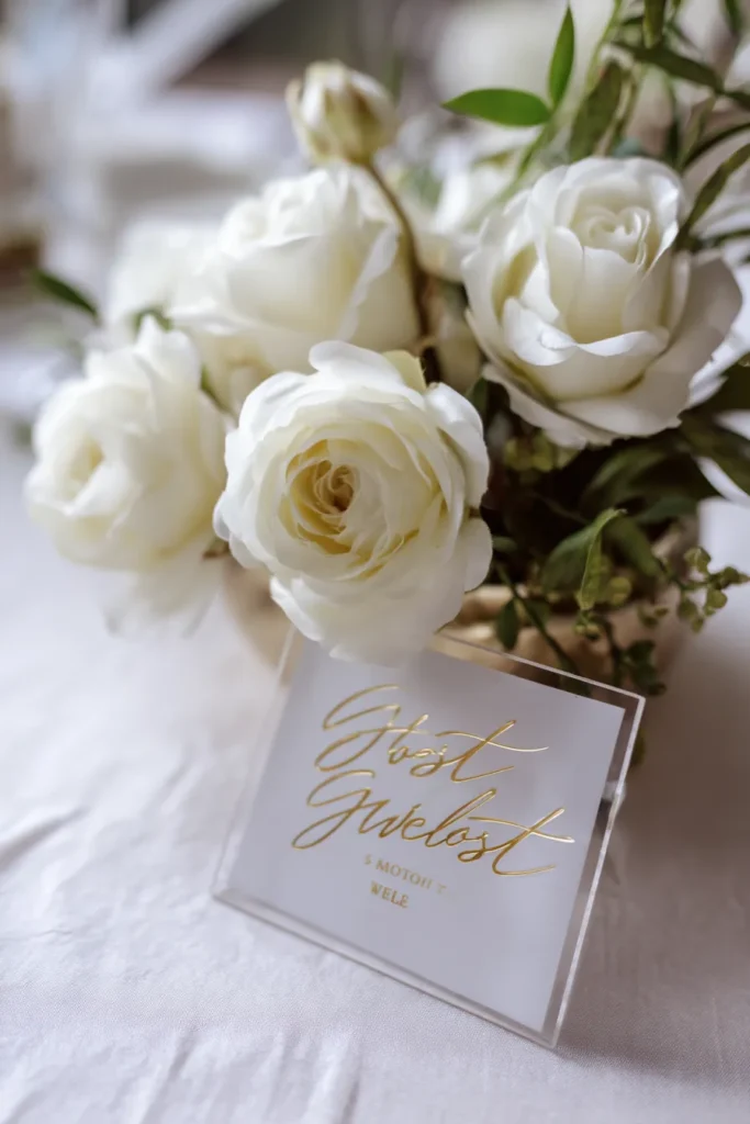 I am absolutely head over heels for these acrylic table numbers. They are so chic and modern, and that gold calligraphy is just stunning. It’s such a thoughtful touch that really elevates the whole table design without being too busy. Paired with those gorgeous white roses, it creates a look that is both timeless and incredibly stylish. It’s those little luxurious details that make a wedding feel truly special, and this one definitely hits the mark for me.