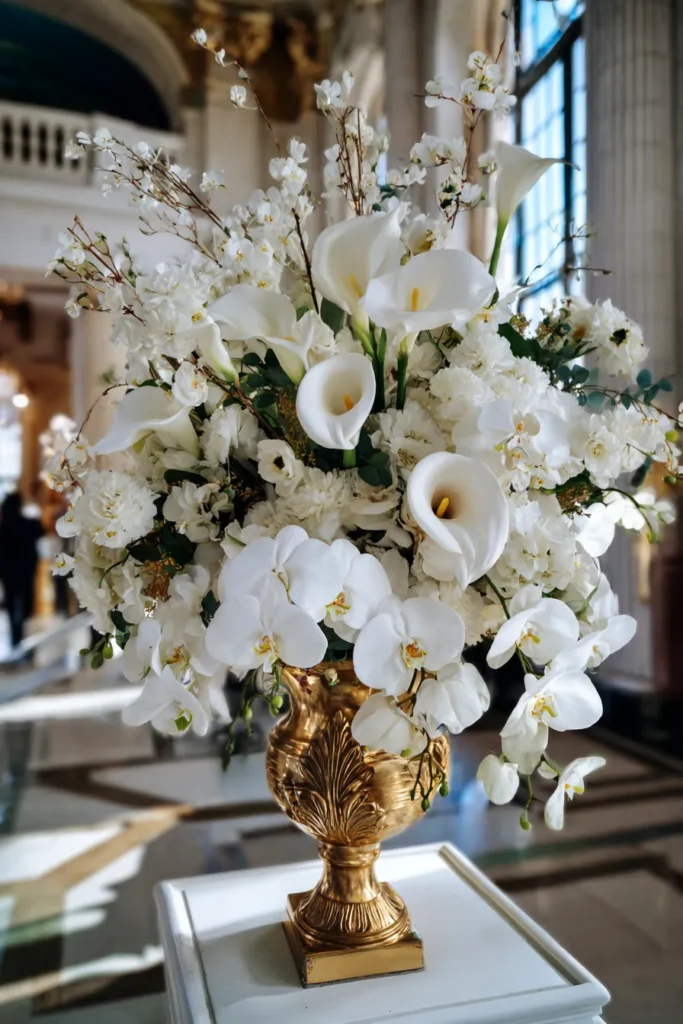 This truly is a grand centerpiece fit for a beautiful winter wedding reception in an opulent venue. The flowers are arranged in a heavy, ornate gold urn with classic carved details, giving it a regal, antique look. The arrangement itself is an incredible display of pure white blooms, featuring elegant Calla Lilies, cascading Phalaenopsis orchids, and fluffy clusters of hydrangeas and small blossom branches, creating an oversized, incredibly lush silhouette.
