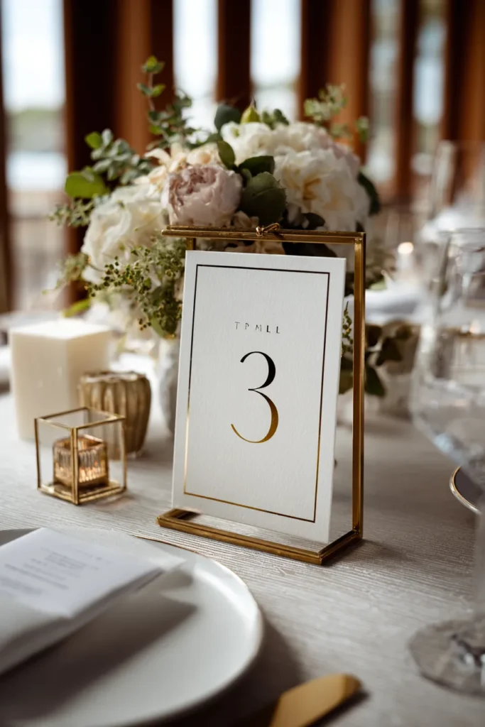 This table number display is the epitome of clean, modern luxury. The card itself is a crisp white with a delicate gold border and features an elegant, oversized number in a lovely gold gradient. It’s held perfectly upright in a sleek, architectural brass geometric frame, which adds height and visual interest without being bulky. Around it, you can spot soft florals, a chunky white candle, and a tiny matching brass cube holding another delicate candle, creating a layered, luminous look.