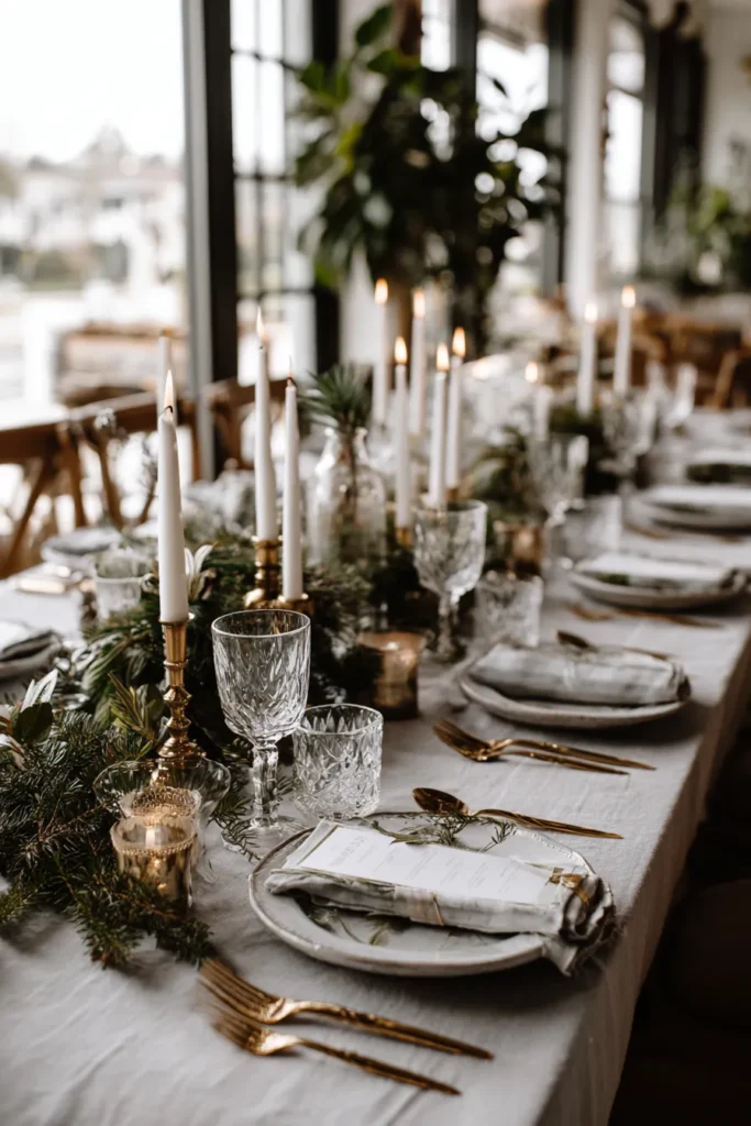 This gorgeous design captures a feeling of natural luxury, perfect for a chic winter wedding reception or an elegant rehearsal dinner. The long table is draped in a soft, light gray or off-white linen, creating a beautifully neutral canvas. A lush, natural garland runs down the center, featuring a gorgeous mix of deep green evergreen boughs and maybe some subtle pinecones. The place settings are truly exquisite, pairing crisp white plates with elegant gold-rimmed accents and striking gold flatware. It all comes together with beautiful crystal glassware and a multitude of tall white taper candles in antique-looking brass or gold holders, casting the most wonderfully warm glow across the scene.