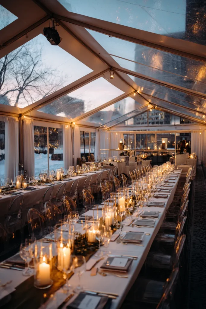 This stunning reception is set inside a crystal-clear tent, providing a breathtaking, sheltered view of the snowy evening outdoors and the beautiful twilight sky. The space is arranged with long, elegant banquet tables dressed in clean white linen and lined with modern ghost chairs. The atmosphere is pure romance thanks to the abundant candlelight everywhere, featuring thick pillar candles in varying heights down the center of each table. Simple green garlands or table runners add a pop of color, while warm string lights overhead ensure the space feels incredibly cozy and bright, despite the cold outside.