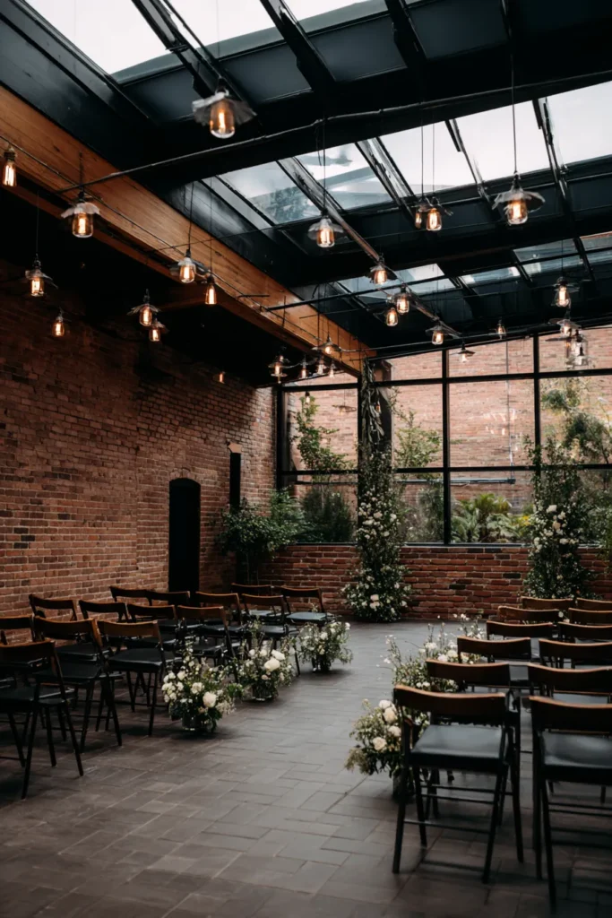 This striking ceremony location is set within a fantastic industrial venue, featuring exposed red brick walls and a dramatic glass ceiling that lets the light stream in. The seating is simple and modern with rows of sleek dark wooden chairs, keeping the focus on the beautiful architectural details. Overhead, raw wooden beams are strung with trendy exposed bulb Edison lights, adding a warm, vintage glow. The aisle is beautifully defined by rustic floral arrangements, featuring tall green trees and smaller clusters of white roses and hydrangeas at the base, bringing a lovely touch of soft nature into the edgy, urban setting.