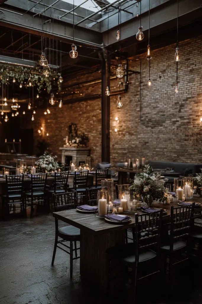 I am totally captivated by the incredible atmosphere in this photo—it is just so unique and romantic! I love how the dark colors and the rustic texture of the brick are completely transformed by the sheer amount of warm, buttery light from all those exposed bulbs and the hundreds of candles. It’s the perfect blend of trendy industrial style with classic, soft romance. It truly feels like the coziest, most dramatic space for a memorable celebration where everyone can gather closely and feel instantly at ease.
