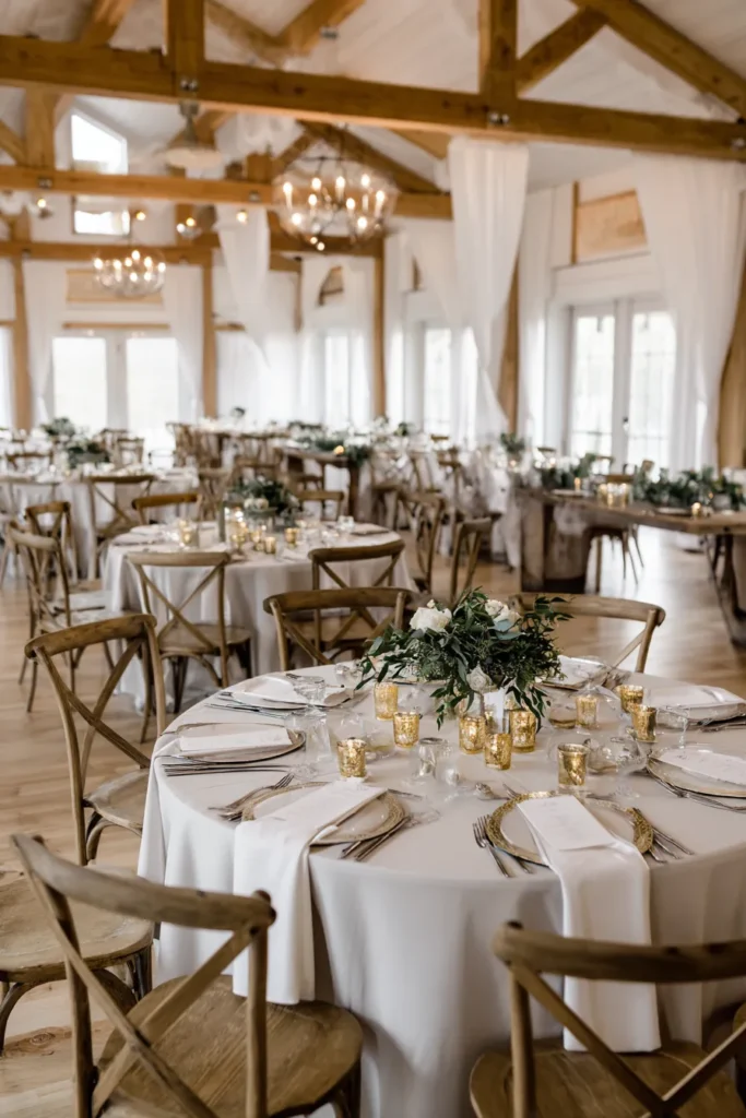This beautiful space is designed to feel open and airy, featuring an incredible soaring ceiling with exposed wooden beams that immediately give off a cozy, rustic barn or lodge feel. The venue is softened beautifully with elegant, sheer white drapery hanging from the beams and framing the large windows, which allows natural light to flood the room. Round tables are covered in a soft, neutral-colored linen, perfectly matched with charming cross-back wooden chairs. Each table is made festive with lush, low centerpieces of white flowers and deep green foliage, accented by beautiful gold metallic votives that cast a warm, flickering light across the whole scene.