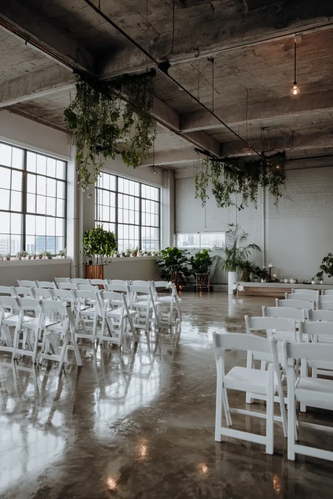 This beautiful ceremony is set inside a cool, industrial loft space with a towering ceiling and bright oversized grid windows that flood the room with natural light. The raw, urban details, like the concrete floor and exposed ceiling beams, are beautifully contrasted by the softness of the decor. Seating consists of simple, clean rows of white wooden folding chairs. Above the simple altar, lush clusters of cascading greenery are suspended from the ceiling, adding an organic, dramatic touch, while potted plants are scattered around to bring life and color into the minimalist space.