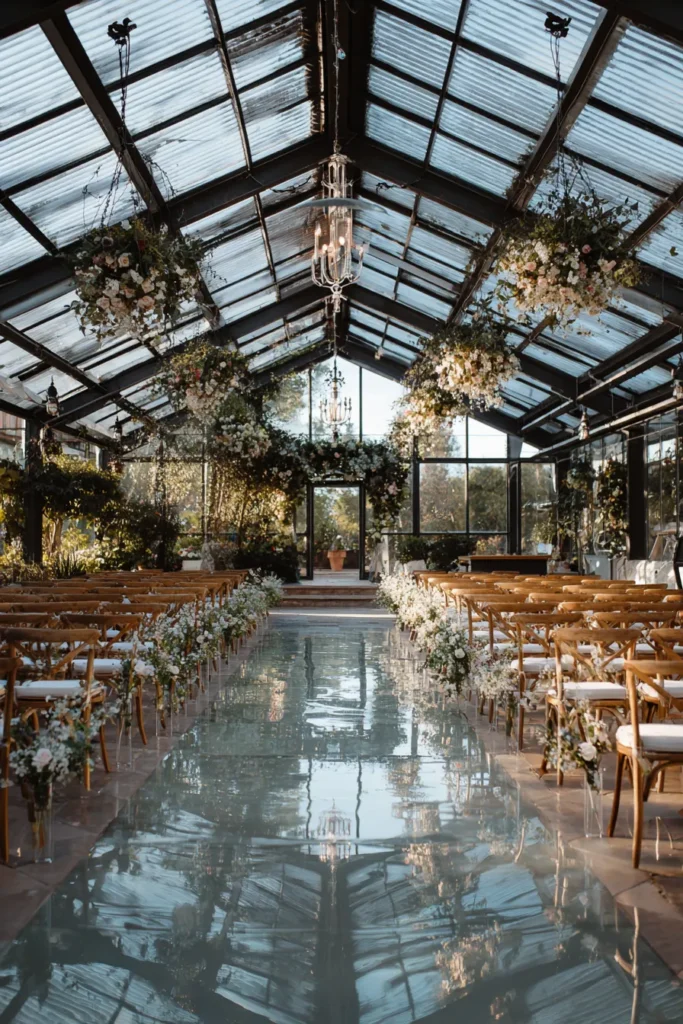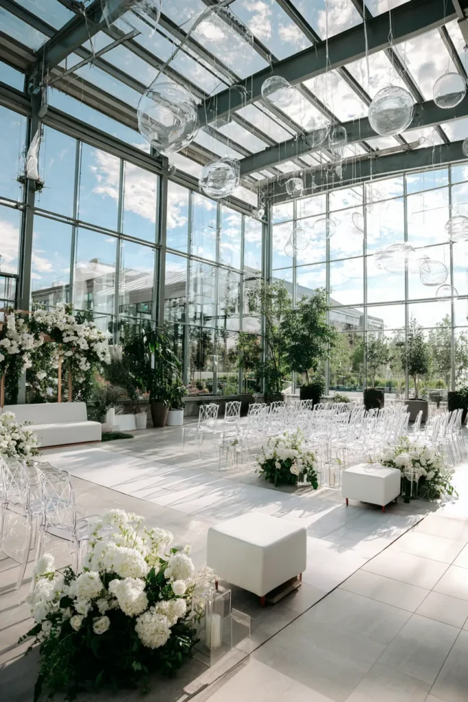 This incredible ceremony space is set inside a stunning glass-enclosed pavilion with soaring ceilings and walls that let in an abundance of natural light, offering expansive views of the surrounding greenery. The overall look is modern, minimalist, and beautifully clean, focusing on a crisp white and clear color palette. The seating is modern with rows of sleek acrylic ghost chairs, and the aisle is flanked by stunning, voluminous arrangements of white hydrangeas and roses. Delicate, floating glass orbs are suspended from the ceiling, adding a whimsical touch and reflecting the light beautifully, making the whole space feel like it’s glowing.