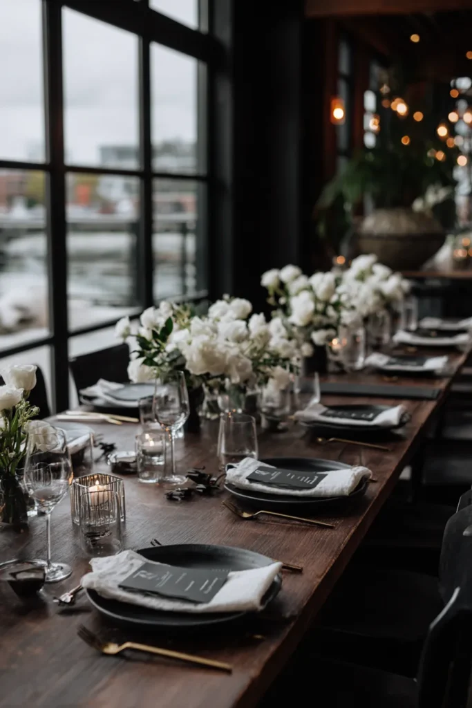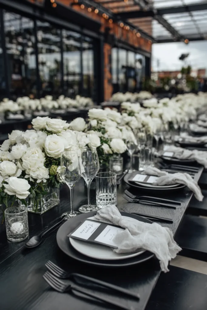 This breathtaking design centers around a sleek dark black wooden table, immediately setting a moody and modern tone for the reception. The look is beautifully minimalist and elegant, using a striking monochromatic palette of black and white. Each place setting features dark charcoal or black matte plates and black flatware, perfectly contrasted by soft white napkins tied in a simple knot. Running down the table is a lush, continuous centerpiece of voluminous white roses and white hydrangeas, creating a stunning visual pop against the dark wood. Clear glassware and small votives add just a touch of sparkling detail to this incredibly stylish setting.