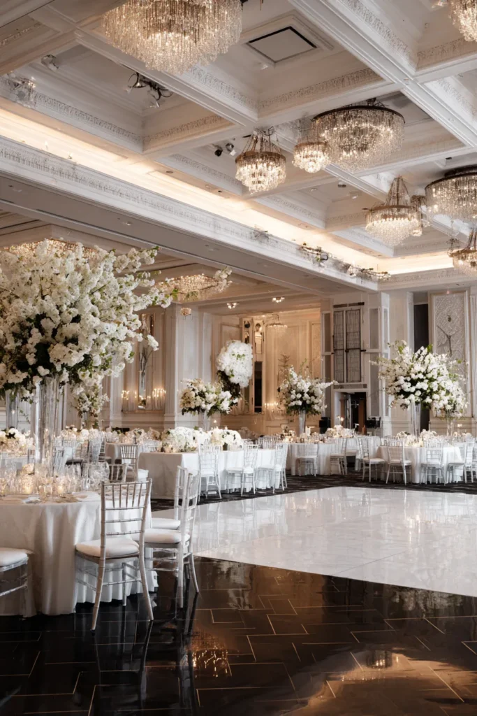 This spectacular ballroom is designed for absolute luxury, featuring high ceilings adorned with multiple, dazzling crystal chandeliers that sparkle and cast a romantic glow throughout the entire space. The decor is centered around a breathtaking all-white floral theme, with towering arrangements of white cherry blossoms and other lush white flowers in elegant glass vases, creating a dramatic visual impact. Round tables are draped in crisp white linens, complemented by chic silver chiavari chairs that add a touch of glamour. A gleaming white and black checkered dance floor takes center stage, ready for a night of celebration under the sparkling lights.