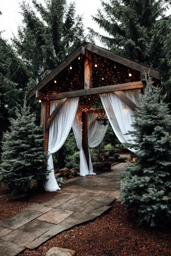 This absolutely charming ceremony arch is set within a rustic wooden gazebo-like structure, nestled perfectly among tall, majestic pine trees, creating an incredibly intimate and natural woodland feel. The rich, dark wood beams are beautifully strung with countless warm fairy lights and larger globe lights, casting a soft, romantic glow. Flowing white sheer drapes are gracefully tied back on the wooden posts, adding a touch of ethereal softness and elegance. Flanking the entrance are two adorable, smaller evergreen trees, perfectly hinting at a cozy winter celebration amidst nature’s beauty.