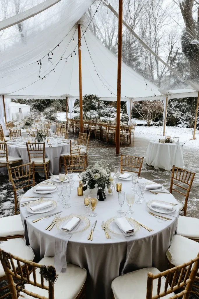 I think this whole setup is just so incredibly romantic and chic—I mean, a beautiful tent wedding in the snow is just next-level stunning, right? I am obsessed with the combination of the warm, glamorous gold elements against the cool white and gray backdrop of the snow and the tent. It stops the whole scene from feeling too icy and adds that beautiful, rich warmth we all crave in the winter. This design proves that you can absolutely have a gorgeous, elegant outdoor celebration even when there’s a blanket of fresh snow on the ground; it’s pure perfection!.