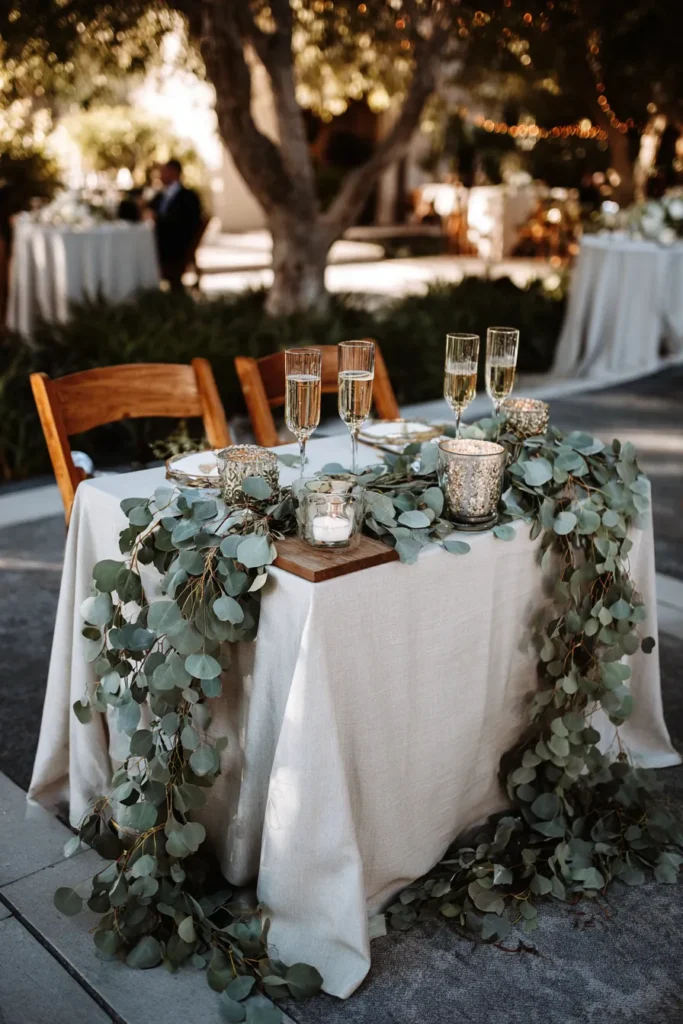 This charming setup features a smaller table, perfect for a sweetheart table or a small family grouping, covered with a soft, neutral linen tablecloth. The focus is on the breathtaking eucalyptus garland that beautifully drapes over the edge, adding a gorgeous cascade of soft, silvery green. This is accented by rustic, distressed mercury glass votives and a small, simple pillar candle nestled on a wooden riser, all glowing with warm light. It’s a wonderfully earthy and romantic design, complemented by the simple wooden chairs and the natural light filtering through the trees in the background.