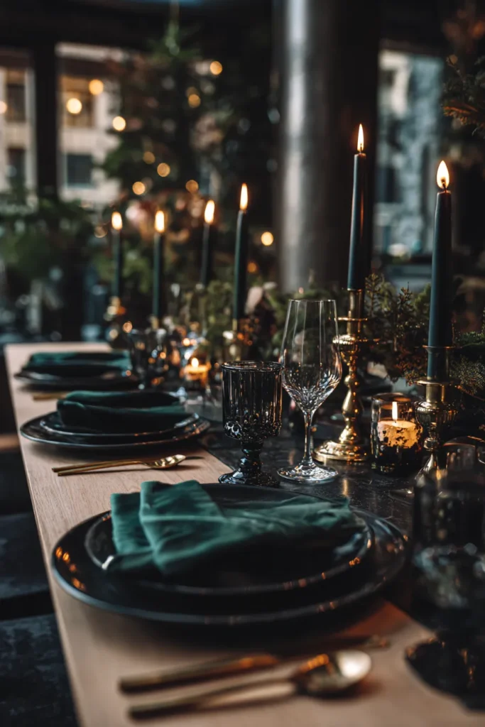 I am completely obsessed with the use of the deep emerald velvet and those bold black candles—it’s just so unexpected and sophisticated! The pops of gold from the flatware and candlesticks make the whole setup feel incredibly rich and warm, perfectly counteracting the dark colors. It’s a beautifully dramatic and highly luxurious take on a winter theme that feels so unique and personal. If you love a moody, intimate, and totally glamorous dinner party vibe, this tablescape is the absolute dream!