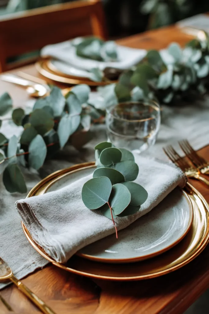 This beautifully styled place setting is the perfect balance of rustic charm and refined elegance, great for a minimalist winter wedding theme. It features a stunningly simple gold charger plate under a speckled cream dinner plate, creating a lovely frame. The focus is on the textures: a natural, soft linen napkin is neatly tucked onto the plate, crowned by a perfect sprig of cool, silvery-green eucalyptus. The warm, light wood table peeking out from under a linen runner complements the gold accents and the gold flatware, giving the whole look a wonderfully natural and warm feel.