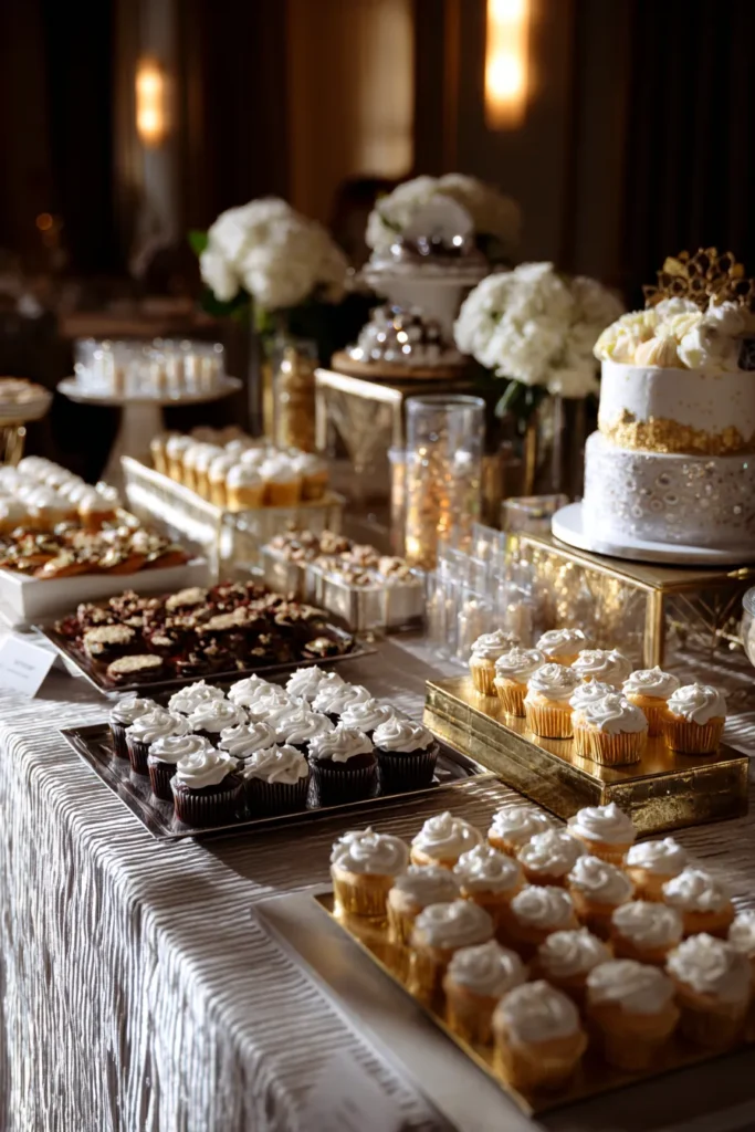 This stunning dessert table is designed for maximum visual impact, perfect as a gorgeous late-night feature at a winter wedding reception. The table is draped in a shimmering, crinkle metallic linen that catches the light beautifully, creating a glamorous backdrop for the sweets. The display is filled with a variety of delicious treats, including trays of rich chocolate brownies and rows of neat white-frosted cupcakes, presented on sleek silver and gold trays. A beautiful two-tiered cake topped with white florals and gold glitter is the stunning focal point, surrounded by elegant glass jars and shimmering gold accents, making the whole setup sparkle!