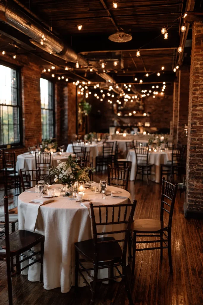 I am head-over-heels obsessed with how wonderfully warm and absolutely magical this venue looks—it is just pure cozy perfection! I love that the rustic, slightly raw feel of the exposed wood and brick is completely softened by the thousands of twinkling lights, making the whole room feel incredibly intimate and inviting. Those illuminated tree branches are such a genius touch for a winter wedding, adding a whimsical, fairytale element to the industrial setting. This is exactly the kind of beautiful, unforgettable space where you want to celebrate your love all night long!